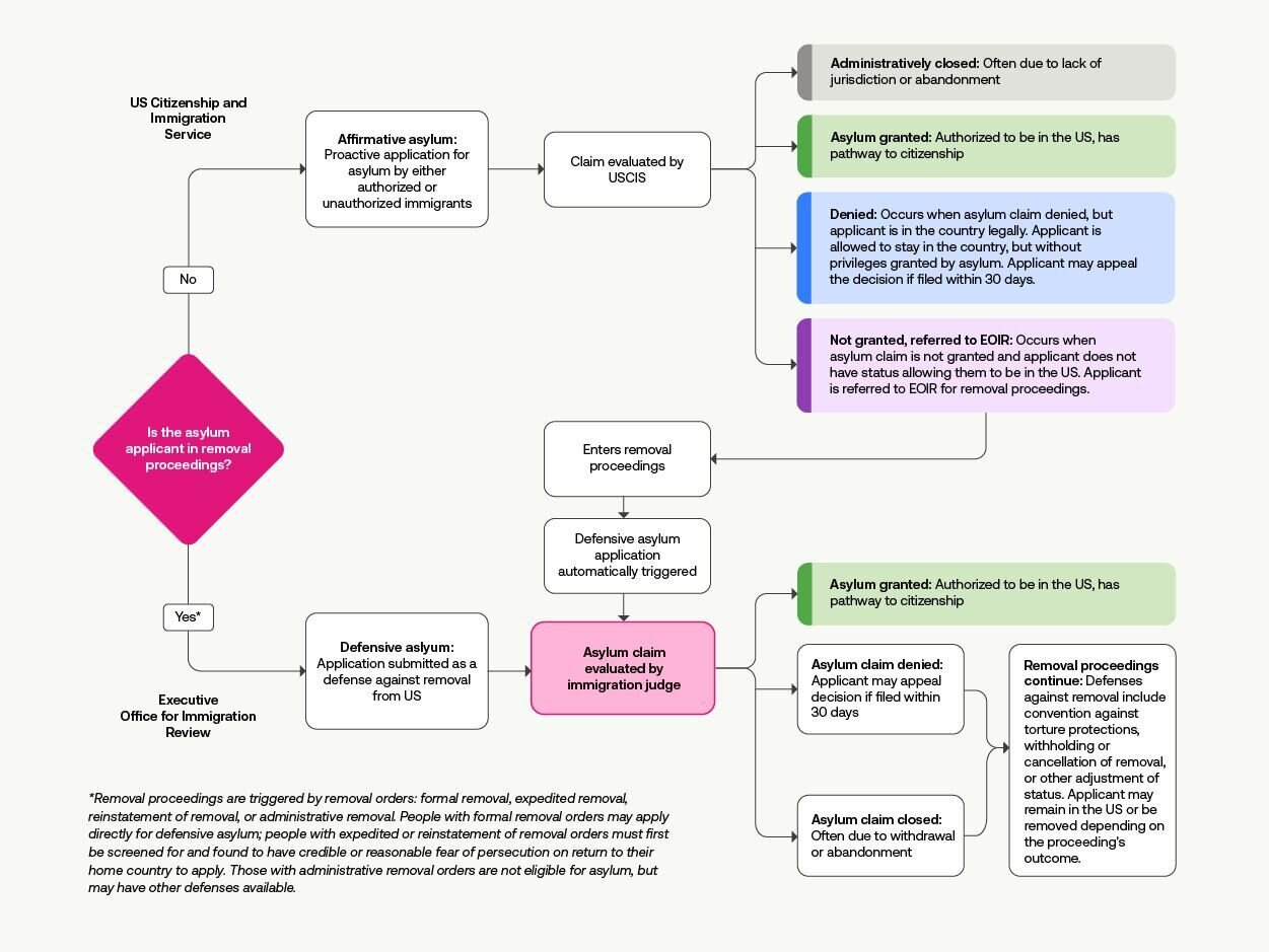 There are two types of asylum claims, affirmative and defensive. Affirmative asylum is a proactive application for permission to stay in the US because a person has suffered persecution or fears they will suffer persecution if they return to their home country. Defensive asylum is an application against deportation once the US starts removal proceedings have started. Only the latter go before immigration judges.