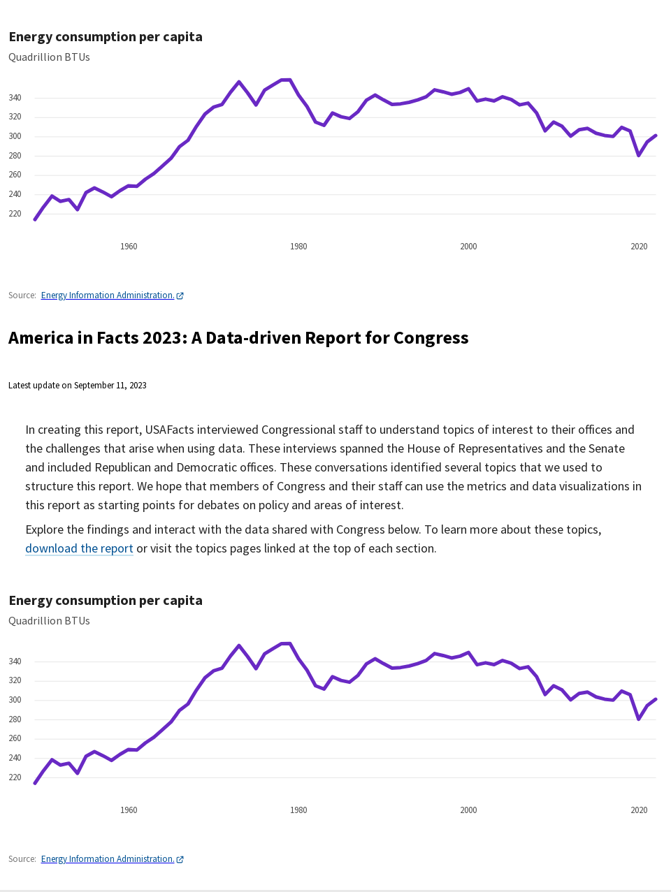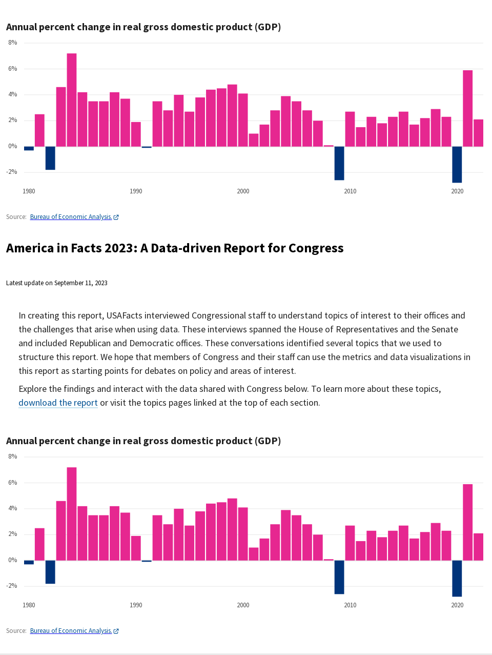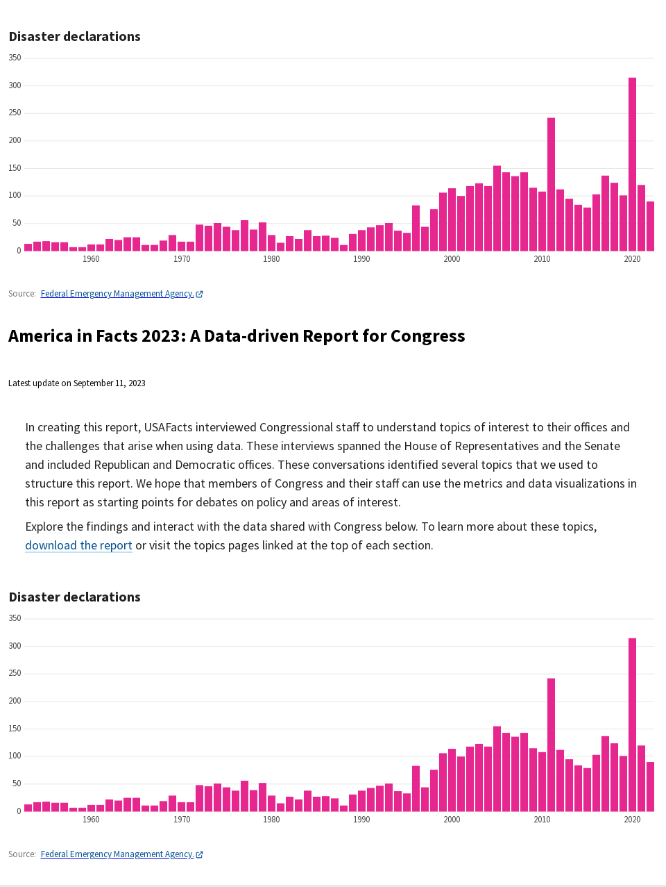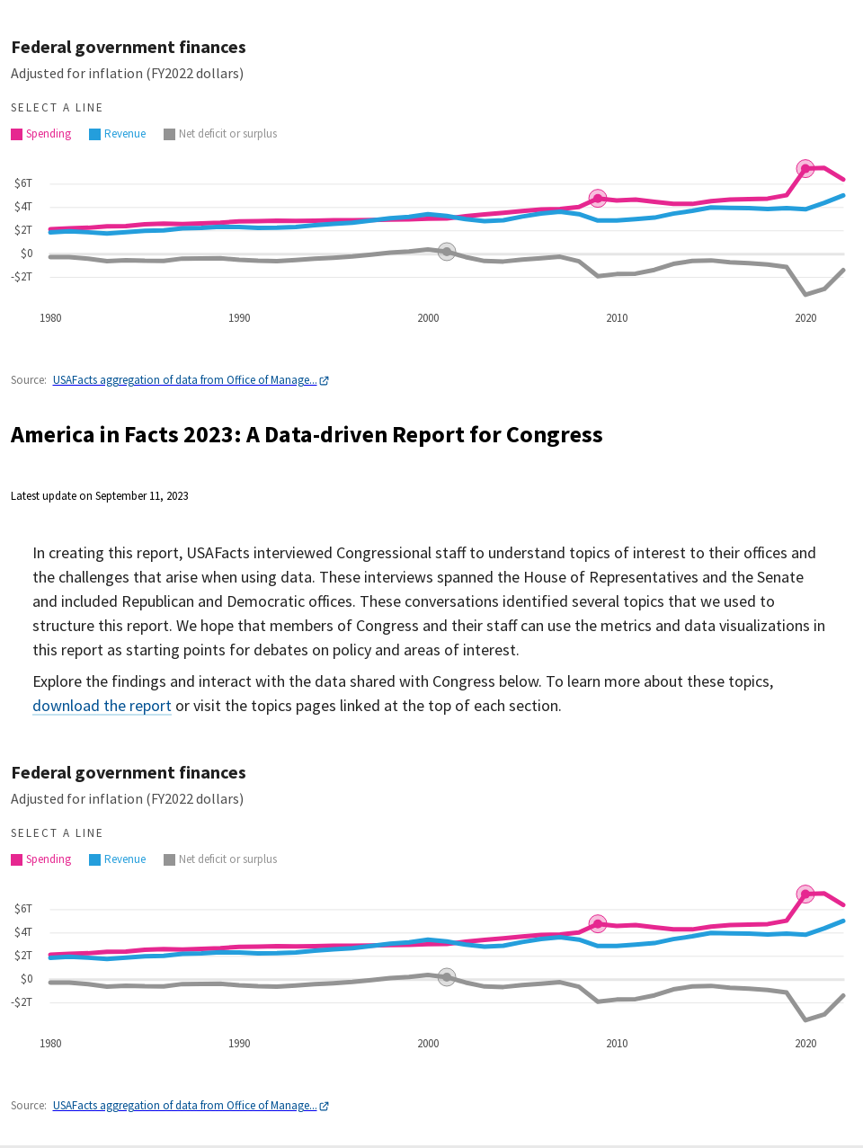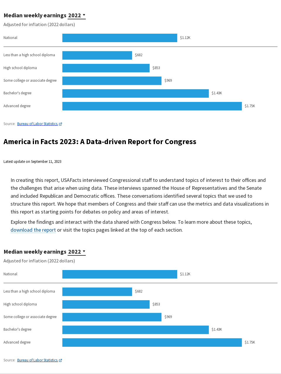 In creating this report, USAFacts interviewed Congressional staff to understand topics of interest to their offices and the challenges that arise when using data. These interviews spanned the House of Representatives and the Senate and included Republican and Democratic offices. These conversations identified several topics that we used to structure this report. We hope that members of Congress and their staff can use the metrics and data visualizations in this report as starting points for debates on policy and areas of interest.
