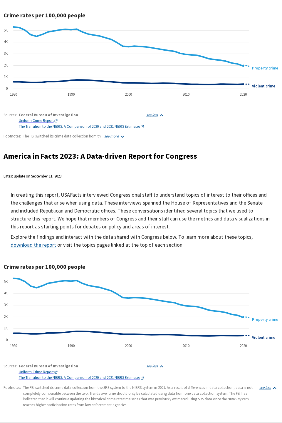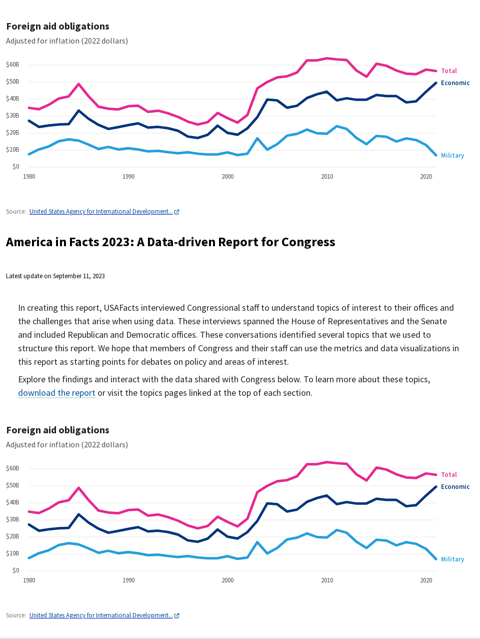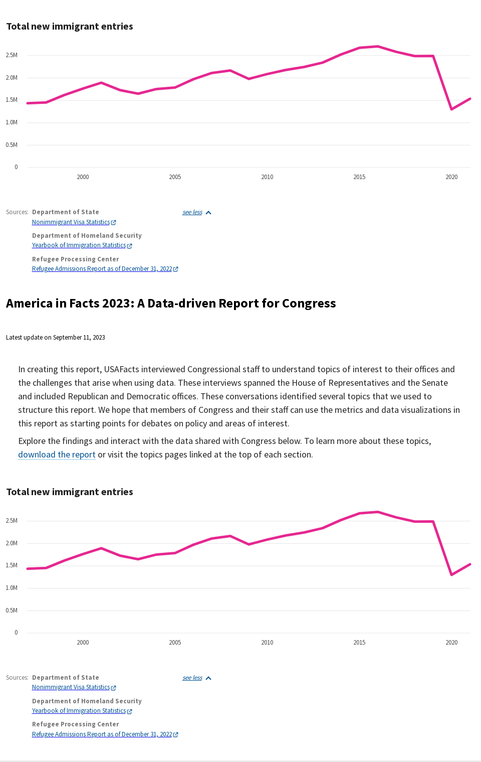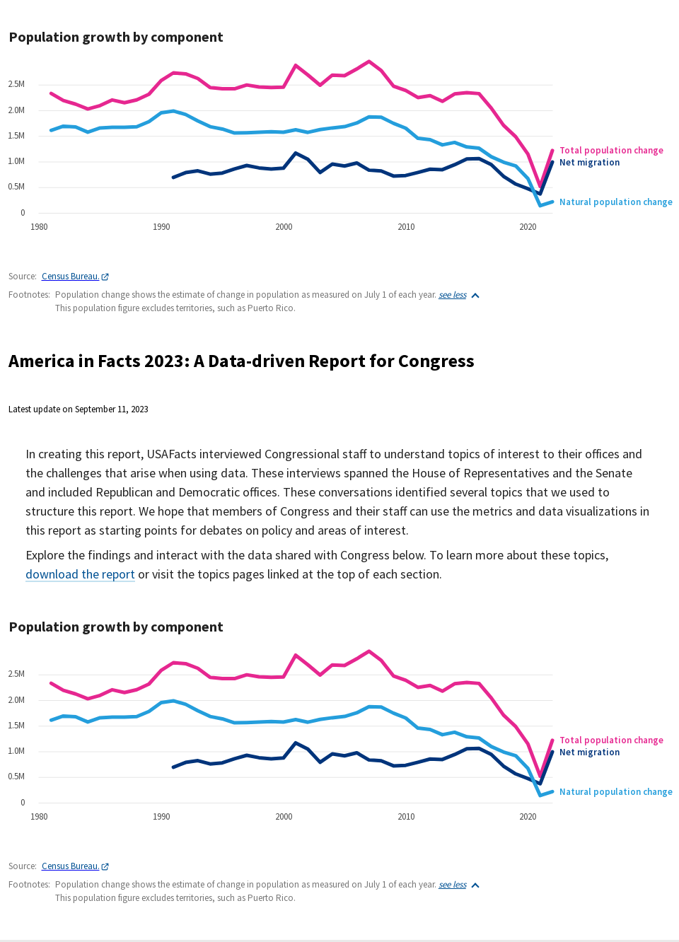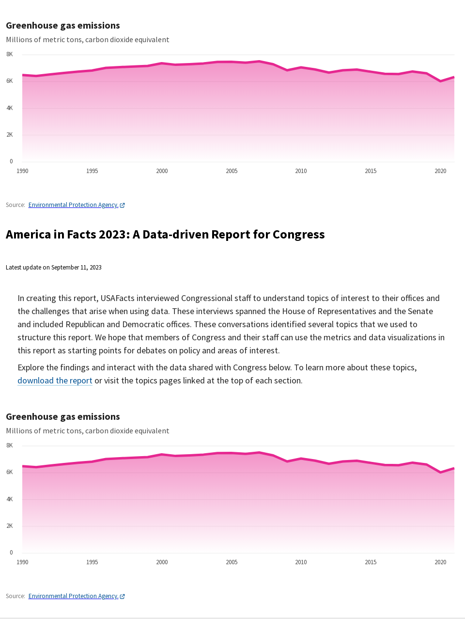 In creating this report, USAFacts interviewed Congressional staff to understand topics of interest to their offices and the challenges that arise when using data. These interviews spanned the House of Representatives and the Senate and included Republican and Democratic offices. These conversations identified several topics that we used to structure this report. We hope that members of Congress and their staff can use the metrics and data visualizations in this report as starting points for debates on policy and areas of interest.